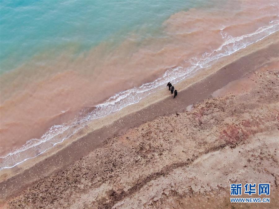 在可可西里索南達(dá)杰保護(hù)站管護(hù)區(qū)域內(nèi)的湖泊附近,龍周才加(中)與隊(duì)友才仁多杰(左)、王文豪在巡視(6月30日攝,無(wú)人機(jī)照片)。新華社記者 張龍 攝