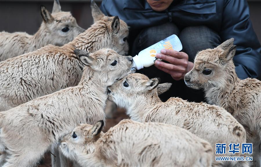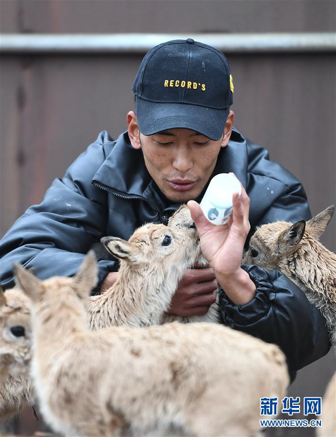 7月7日,三江源國家公園管理局長(zhǎng)江源園區(qū)可可西里管理處卓乃湖保護(hù)站的工作人員才文多杰在給藏羚羊幼仔喂奶。新華社記者 薛玉斌 攝