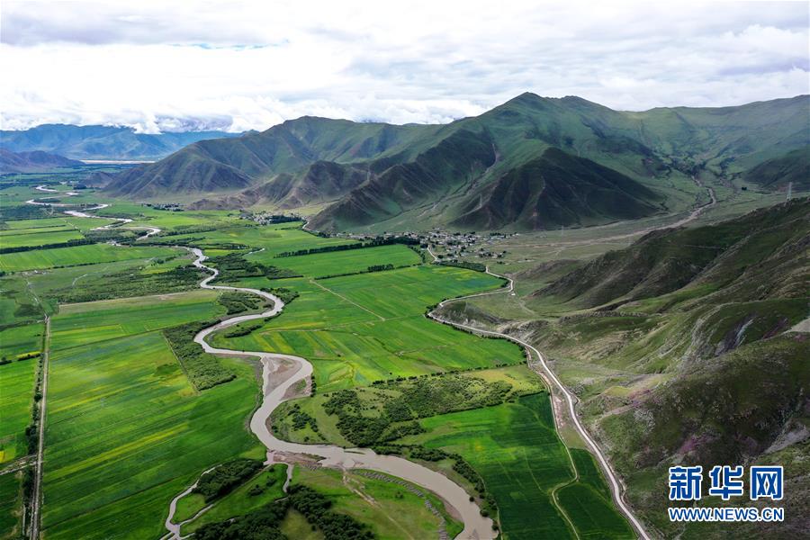 拉薩市林周縣江熱夏鄉(xiāng)田園景色(7月14日攝,無人機照片)。林周縣地處西藏中部,拉薩河上游。夏日時節(jié),這里水草豐茂,綠意盎然,河流、村落、農田組成一幅美麗的田園畫卷。新華社記者 詹彥 攝