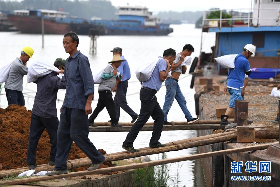 7月14日,當(dāng)?shù)卮迕裢簧习徇\(yùn)砂石袋。近日,受洪水影響,安徽省望江縣華陽鎮(zhèn)境內(nèi)的江調(diào)圩內(nèi)部道路漫水,搶險(xiǎn)車輛無法進(jìn)入。當(dāng)?shù)胤姥床块T組織船只裝載砂石袋等防汛物資,運(yùn)往圩堤保防汛。新華社記者 劉軍喜 攝
