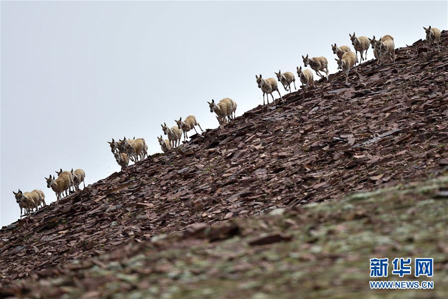 7月7日在可可西里卓乃湖區(qū)域拍攝的一群藏羚羊。目前正值藏羚羊產(chǎn)仔季。來自青海三江源、新疆阿爾金山、西藏羌塘等地的藏羚羊來到位于青海省可可西里腹地、被譽(yù)為“藏羚羊大產(chǎn)房”的卓乃湖區(qū)域產(chǎn)仔。新華社記者 薛玉斌 攝