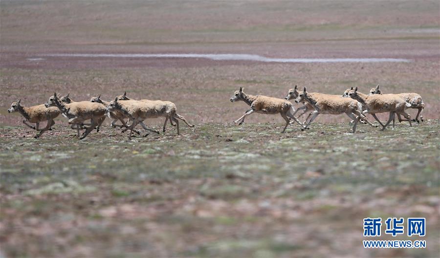 7月7日在可可西里卓乃湖區(qū)域拍攝的一群藏羚羊。目前正值藏羚羊產(chǎn)仔季。來自青海三江源、新疆阿爾金山、西藏羌塘等地的藏羚羊來到位于青海省可可西里腹地、被譽(yù)為“藏羚羊大產(chǎn)房”的卓乃湖區(qū)域產(chǎn)仔。新華社記者 張龍 攝