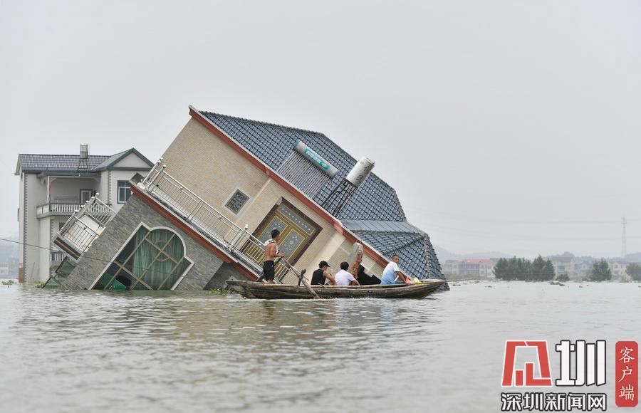 2020年7月15日,江西省鄱陽縣油墩街鎮(zhèn)同興村,村莊受到洪水圍困,大部分村民已經(jīng)被轉(zhuǎn)移出去,仍有少數(shù)村民選擇留守家中積極自救繼續(xù)生活。7月8日晚,鄱陽縣油墩街鎮(zhèn)西江因特大暴雨出現(xiàn)漫堤決口,5個行政村被洪水圍困,數(shù)萬名群眾被及時疏散轉(zhuǎn)移。同興村村民張瑤康回憶起了當時的場景,“水一下子就涌進來,等緩過神來趕緊向二樓轉(zhuǎn)移一樓的物品。洪水來時只從一樓搶到了一些輕便易拿的東西,冰箱、洗衣機之類的大物件,至今仍浸泡在一樓水中?!?5日,記者跟隨張瑤康乘船回家,抵達后看到,一樓淹沒在水中,一個綁在二樓護欄的木梯成為進出“家門”的唯一通道。“每天劃船去村里運送水和食物,家里有煤氣罐和灶臺。因為80多歲的老母親行動不便,我們選擇留守家中?!薄半m然對岸就有安置點,但還是更愿待在自己家里,一來是不愿意給政府添麻煩,二來能每天看著自己的房子心里踏實?!蓖d村村民張長來夫婦帶著剛剛領(lǐng)到的大米、方便面、飲用水乘船回到家中。記者在現(xiàn)場看到,隨著各方救援力量和物資的匯聚,被洪水圍困的村民生活雖有不便,但生活仍在繼續(xù)。“房子不倒,家就在,我們要積極面對,早日重建家園?!睆埇幙蹈嬖V記者。