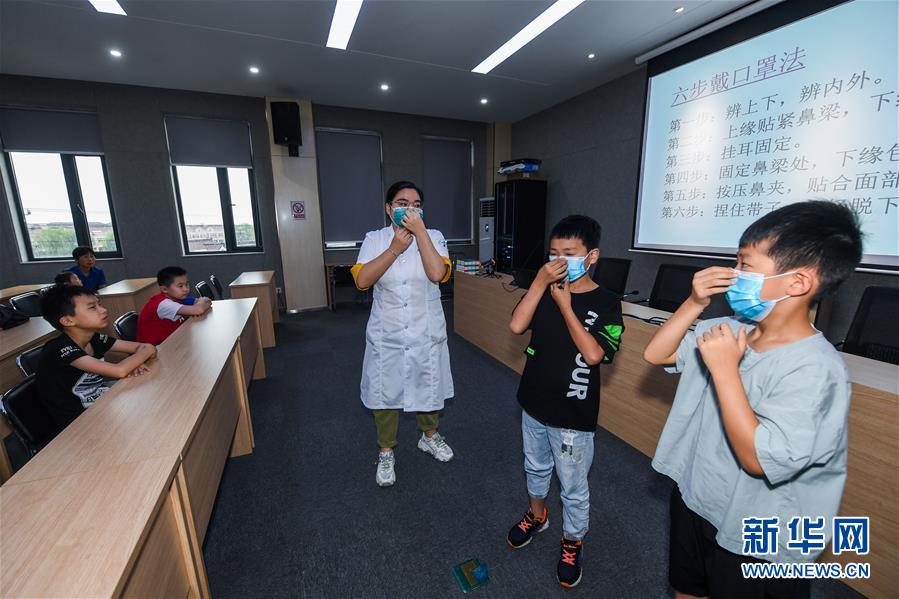 7月16日,小學(xué)生在東林鎮(zhèn)衛(wèi)生院醫(yī)護人員的示范和講解下學(xué)習(xí)正確佩戴口罩。當(dāng)日,浙江省湖州市吳興區(qū)東林鎮(zhèn)舉辦暑期“安全防護小超人”主題活動?;顒佑舍t(yī)護人員、消防隊員等為學(xué)生及家長講授日常安全避險及溺水急救知識,中小學(xué)們還在現(xiàn)場學(xué)習(xí)了簡易包扎、心肺復(fù)蘇的正確方式,并了解滅火器、滅火毯等消防器材的使用,為學(xué)生平安過暑期打好安全防護“預(yù)防針”。新華社記者 徐昱 攝