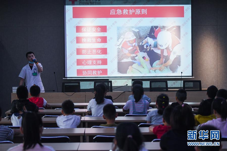 7月16日,東林鎮(zhèn)衛(wèi)生院的醫(yī)護人員(左一)在給學(xué)生們上應(yīng)急救護課。當(dāng)日,浙江省湖州市吳興區(qū)東林鎮(zhèn)舉辦暑期“安全防護小超人”主題活動?;顒佑舍t(yī)護人員、消防隊員等為學(xué)生及家長講授日常安全避險及溺水急救知識,中小學(xué)們還在現(xiàn)場學(xué)習(xí)了簡易包扎、心肺復(fù)蘇的正確方式,并了解滅火器、滅火毯等消防器材的使用,為學(xué)生平安過暑期打好安全防護“預(yù)防針”。新華社記者 徐昱 攝