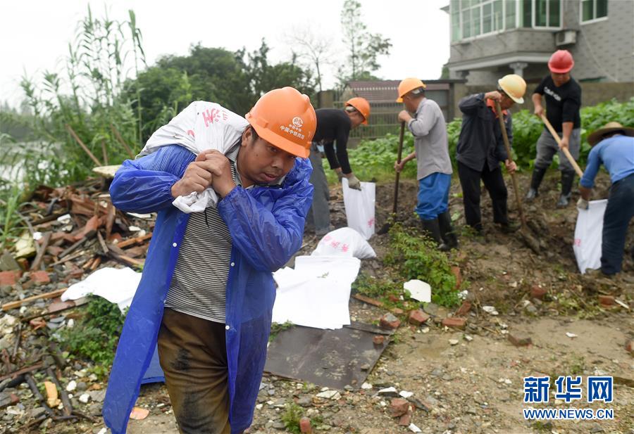 7月17日,防汛人員在秀洲區(qū)新塍鎮(zhèn)小金港村的河道邊加高堤防。浙江省嘉興市秀洲區(qū)處在杭嘉湖平原,受持續(xù)強降雨及上游排水影響,近期,秀洲區(qū)境內的京杭大運河分支航道持續(xù)保持較高水位。當?shù)叵嚓P部門嚴陣以待,落實各項措施,確保安全度汛。新華社記者韓傳號攝