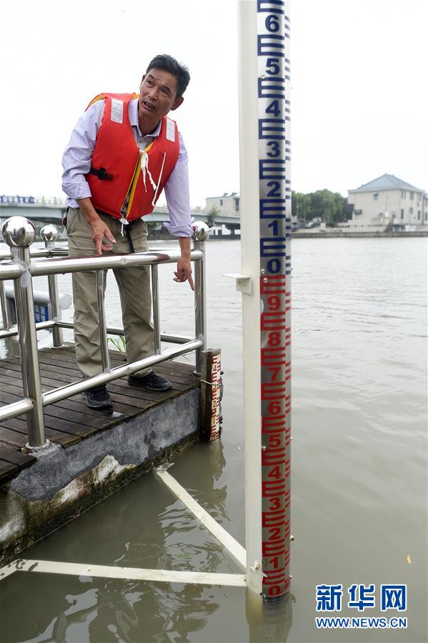 7月17日,王江涇水文站工作人員介紹京杭大運河水位情況。浙江省嘉興市秀洲區(qū)處在杭嘉湖平原,受持續(xù)強降雨及上游排水影響,近期,秀洲區(qū)境內的京杭大運河分支航道持續(xù)保持較高水位。當?shù)叵嚓P部門嚴陣以待,落實各項措施,確保安全度汛。新華社記者韓傳號攝