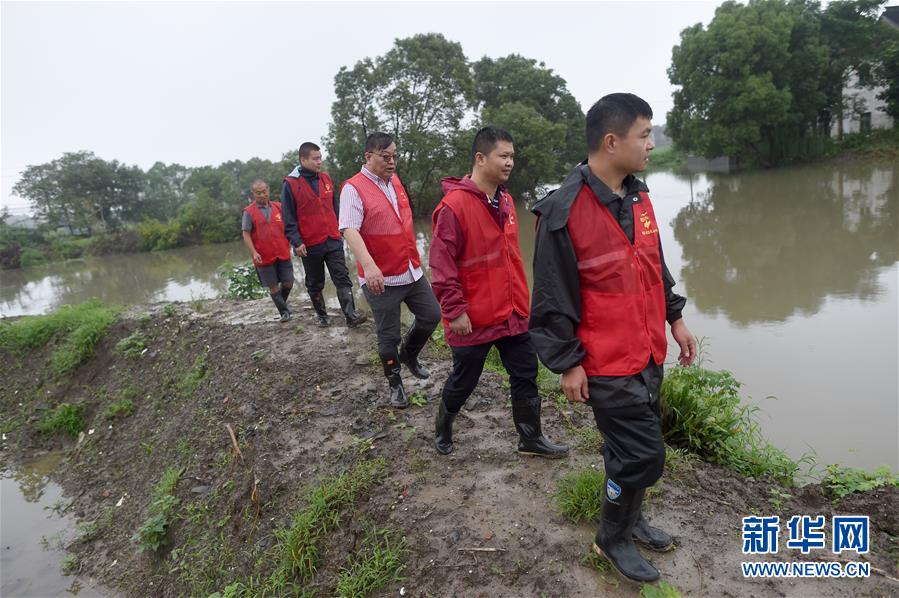 7月17日,基層網(wǎng)格員和志愿者在秀洲區(qū)新塍鎮(zhèn)小金港村的河道邊巡河。浙江省嘉興市秀洲區(qū)處在杭嘉湖平原,受持續(xù)強降雨及上游排水影響,近期,秀洲區(qū)境內的京杭大運河分支航道持續(xù)保持較高水位。當?shù)叵嚓P部門嚴陣以待,落實各項措施,確保安全度汛。新華社記者韓傳號攝