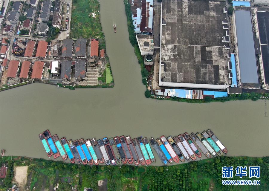 7月17日拍攝的秀洲區(qū)王江涇鎮(zhèn)境內京杭大運河邊臨時停靠的船舶(無人機照片)。浙江省嘉興市秀洲區(qū)處在杭嘉湖平原的低洼地帶,受持續(xù)強降雨及上游排水影響,秀洲區(qū)境內的京杭大運河分支航道持續(xù)保持較高水位。為確保安全度汛,秀洲區(qū)相關部門全力以赴做好防汛各項工作。新華社記者韓傳號攝