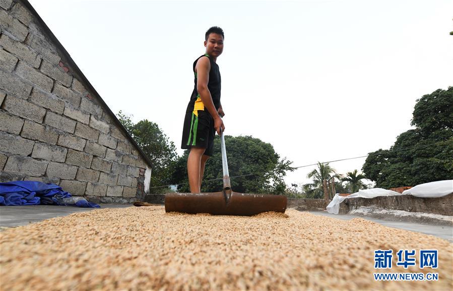 在海南白沙黎族自治縣青松鄉(xiāng)青松村,村民在屋頂晾曬山蘭稻(2019年11月16日)。新華社記者楊冠宇攝