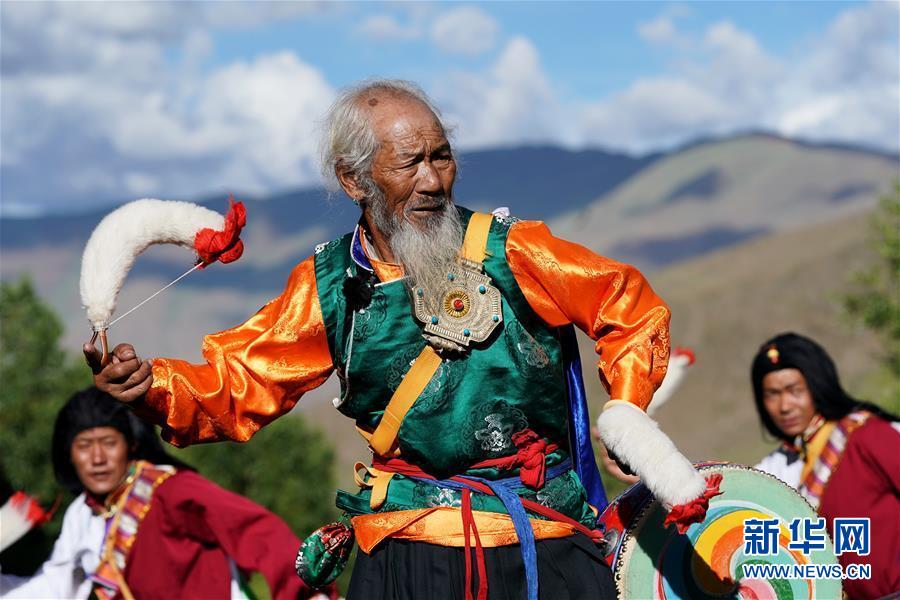 尼瑪老人的弟子們?cè)诒硌荨熬煤幼课琛保?月1日攝)。新華社記者普布扎西攝