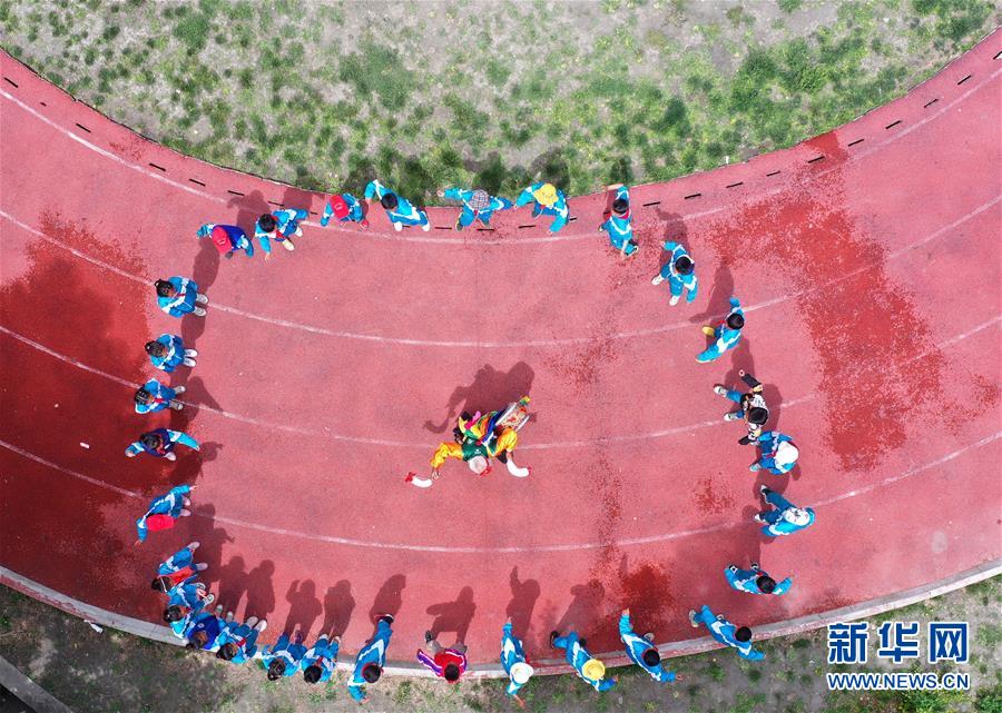 “久河卓舞”傳承人尼瑪在瓊結(jié)縣下水鄉(xiāng)小學(xué)進(jìn)行教學(xué)表演(7月2日攝,無(wú)人機(jī)照片)。新華社記者詹彥攝