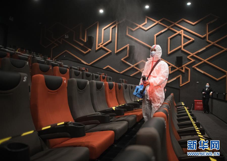 7月20日,武漢一家影院工作人員開展消殺作業(yè)。當(dāng)日,在各項疫情防控措施有效落實到位的前提下,武漢市部分電影院恢復(fù)開放。新華社記者肖藝九攝