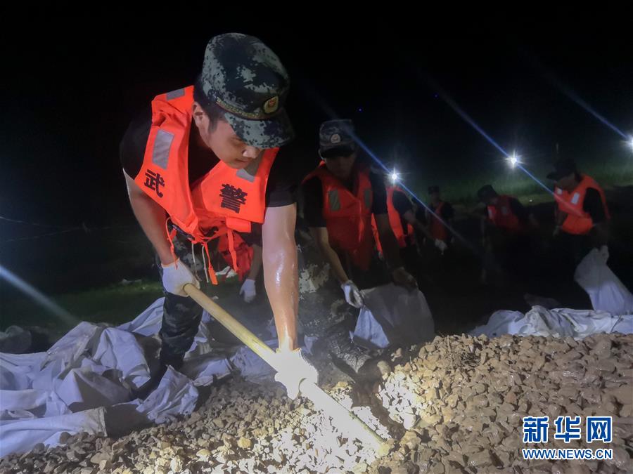 7月20日,在永固垸西線防洪大堤,武警湖南總隊(duì)岳陽(yáng)支隊(duì)官兵處置滲漏險(xiǎn)情。新華社發(fā)(尋樹文攝)