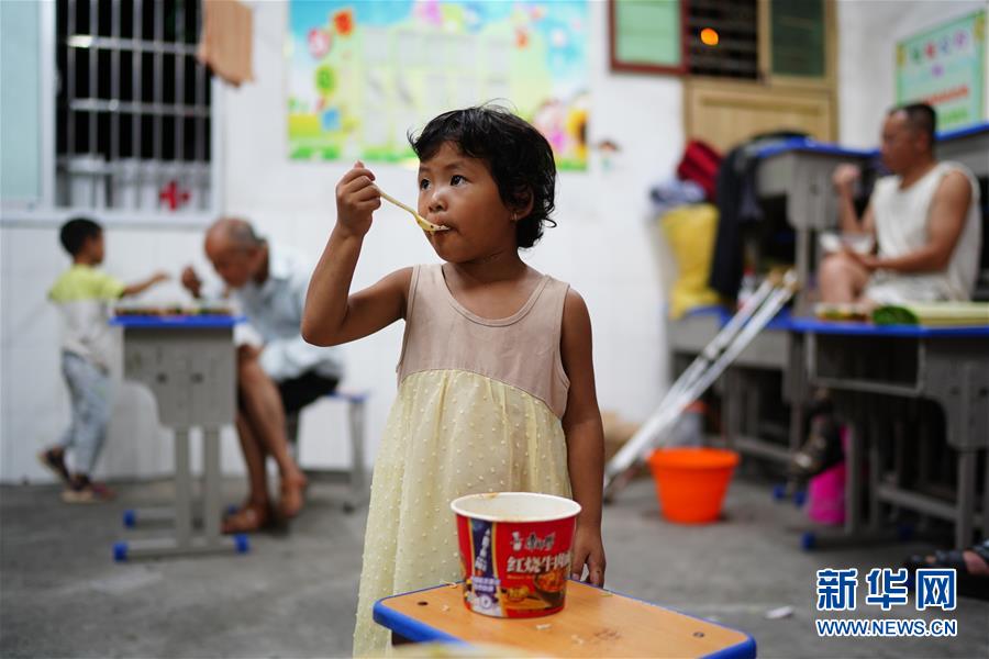 小朋友在江西鄱陽(yáng)縣五一中心學(xué)校安置點(diǎn)吃飯(7月9日攝)。新華社記者周密攝