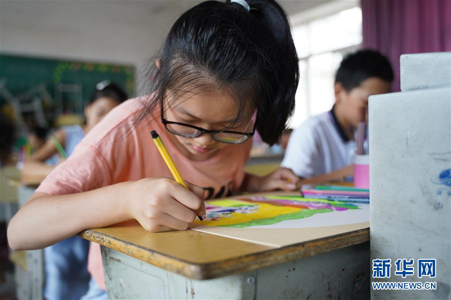 7月23日,在廬山市蛟塘鎮(zhèn)中心小學(xué)安置點,小朋友在美術(shù)課上繪畫。