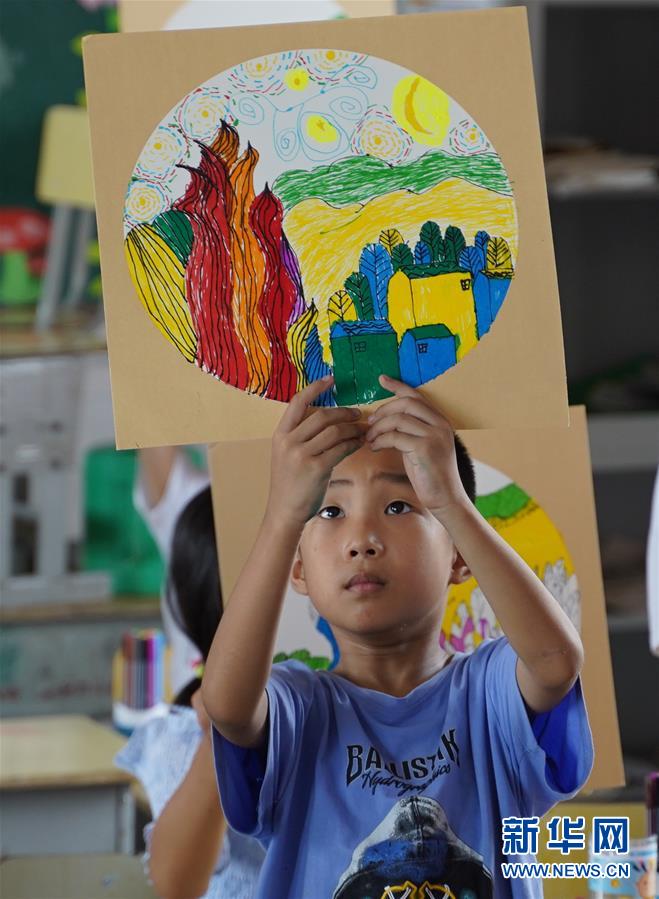 7月23日,在廬山市蛟塘鎮(zhèn)中心小學(xué)安置點(diǎn),老師給孩子們講解美術(shù)作品。新華社記者張浩波攝