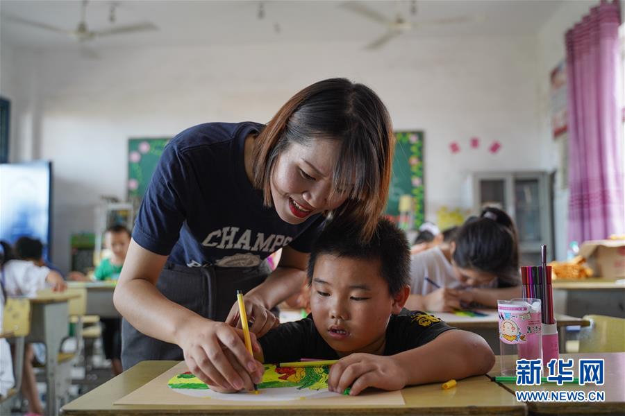 7月23日,在廬山市蛟塘鎮(zhèn)中心小學(xué)安置點,一名老師在指導(dǎo)孩子繪畫。新華社記者張浩波攝