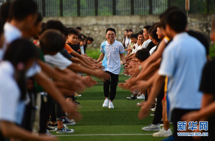 在融水苗族自治縣思源實(shí)驗(yàn)學(xué)校舉辦的支教團(tuán)送別晚會上,支教老師溫昌浩(中)接受同學(xué)們的祝福(7月22日攝)。新華社記者黃孝邦攝