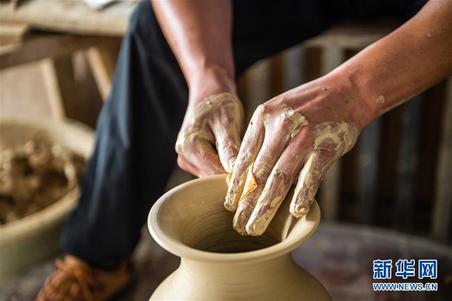 母先才在自家陶藝館里制作陶器(6月16日攝)。新華社記者 陶亮 攝
