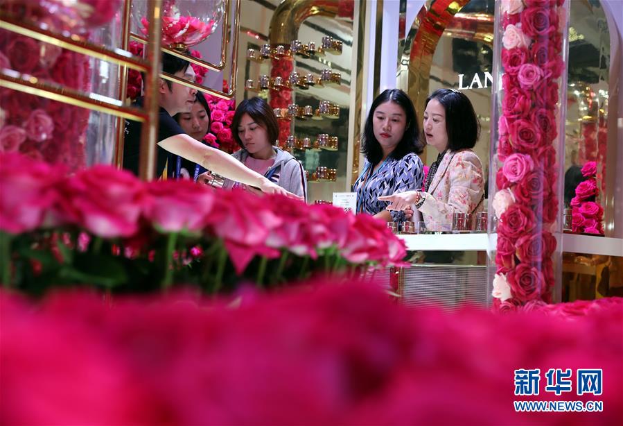 參觀者在第二屆進(jìn)博會(huì)品質(zhì)生活展區(qū)一家化妝品展臺(tái)參觀(2019年11月6日攝)。新華社記者 劉穎 攝