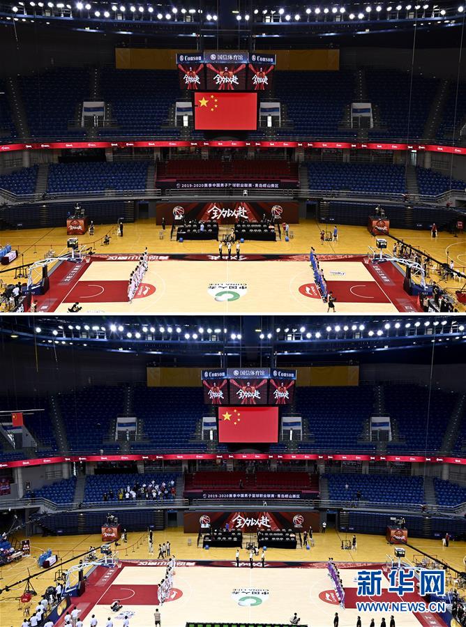 拼版照片的上圖為7月26日遼寧本鋼隊(duì)對陣四川五糧金樽隊(duì)的比賽現(xiàn)場;下圖為7月26日上海久事隊(duì)對陣山東西王隊(duì)的比賽現(xiàn)場,該場比賽首次恢復(fù)觀眾現(xiàn)場觀看比賽。當(dāng)日,在山東青島舉行的2019-2020賽季中國男子籃球職業(yè)聯(lián)賽(CBA)復(fù)賽第二階段(嶗山賽區(qū))比賽中,醫(yī)護(hù)人員、教師、公安戰(zhàn)線人士通過官方購票平臺,完成包括核酸檢測在內(nèi)的相關(guān)流程后進(jìn)場觀看了上海久事隊(duì)迎戰(zhàn)山東西王隊(duì)的比賽。觀賽期間,觀賽者須全程佩戴口罩,對號入座,嚴(yán)格保持間隔一米就座。退場時(shí),觀眾須按照自后向前、先兩邊后中間的順序,保持“一米線”社交距離有序退場。新華社記者 郭緒雷 攝