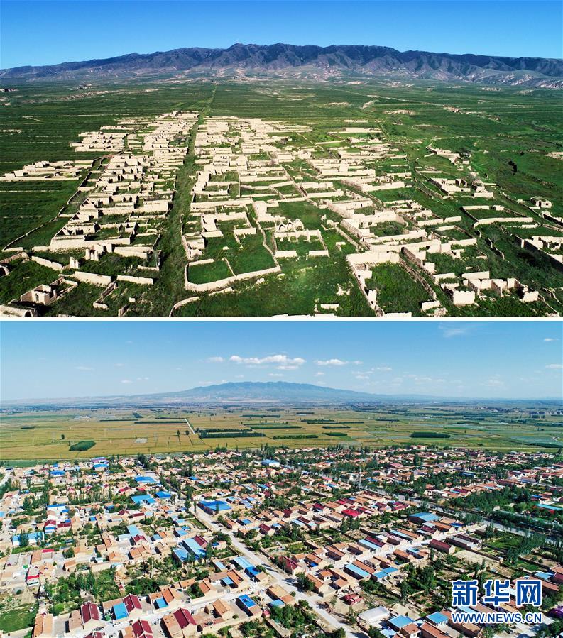 拼版照片:上圖為經(jīng)過多年的生態(tài)修復(fù),寧夏吳忠市紅寺堡區(qū)新莊集鄉(xiāng)移民舊址已逐漸被綠色覆蓋;下圖為戈壁荒灘上建起的紅寺堡移民新村(2018年9月8日攝,無人機(jī)照片)。新華社記者 王鵬 攝