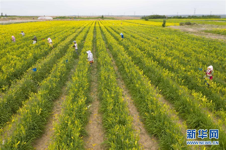 村民在寧夏紅寺堡區(qū)柳泉鄉(xiāng)柳泉村采摘黃花菜(7月11日攝,無人機(jī)照片)。新華社記者 楊植森 攝
