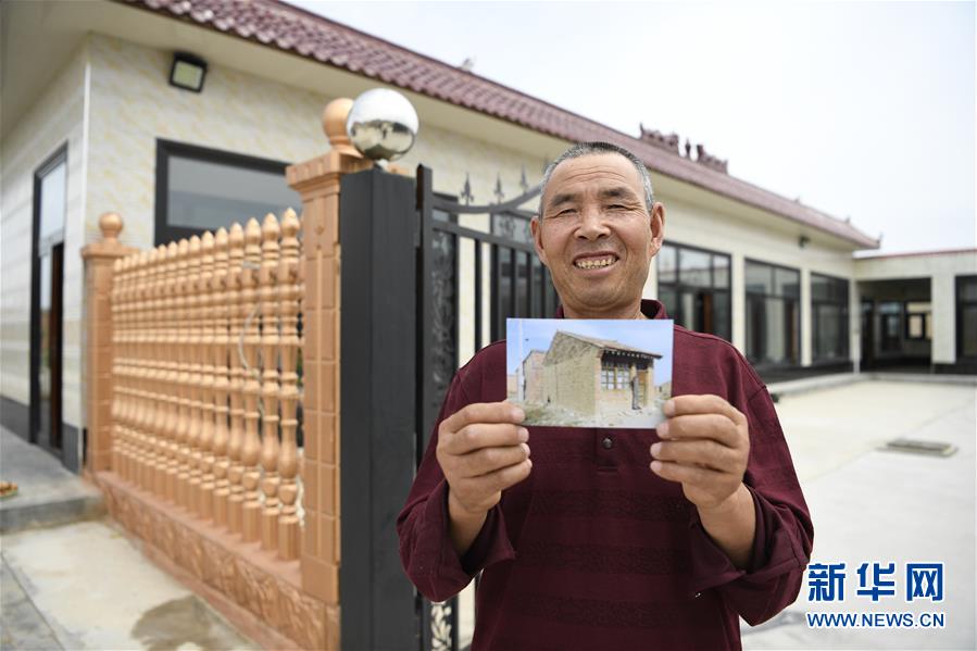 羅宗清在寧夏吳忠市紅寺堡區(qū)新莊集鄉(xiāng)康莊村的新家前展示以前老房子的照片(2019年7月24日攝)。他家于2001年從中衛(wèi)市海原縣搬遷到這里。新華社記者 馮開華 攝