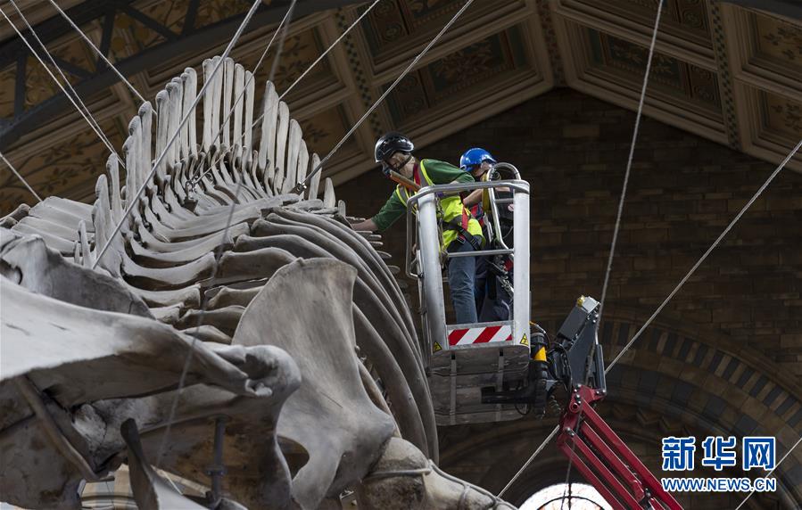 7月27日,工作人員在英國倫敦的自然歷史博物館大廳內清潔一具藍鯨骨架。受新冠疫情影響關閉數月的英國自然歷史博物館將于8月5日重新對外開放,目前館方正在為重新開放做最后準備。參觀者需要提前預約參觀時段、全程佩戴口罩且保持安全距離。新華社記者韓巖攝