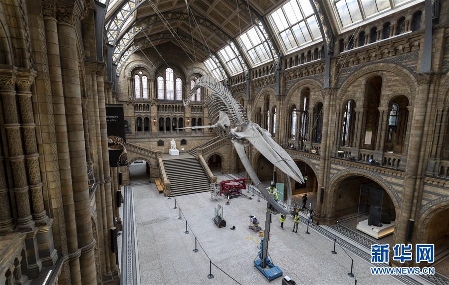 7月27日,工作人員在英國倫敦的自然歷史博物館大廳內(nèi)清潔一具藍(lán)鯨骨架。受新冠疫情影響關(guān)閉數(shù)月的英國自然歷史博物館將于8月5日重新對外開放,目前館方正在為重新開放做最后準(zhǔn)備。參觀者需要提前預(yù)約參觀時(shí)段、全程佩戴口罩且保持安全距離。新華社記者韓巖攝