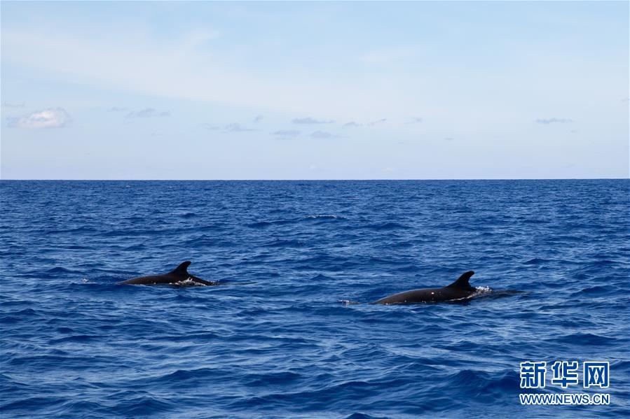 這是7月20日在南海某海域拍攝的弗氏海豚與短肢領(lǐng)航鯨共游場景,后面的黑影為短肢領(lǐng)航鯨。新華社記者張麗蕓攝