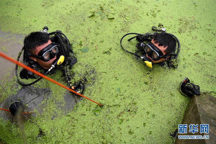 7月24日,在安徽省廬江縣臺創(chuàng)園小南河段,吳正寶(左)和徐宏林準(zhǔn)備潛水。新華社記者劉軍喜攝