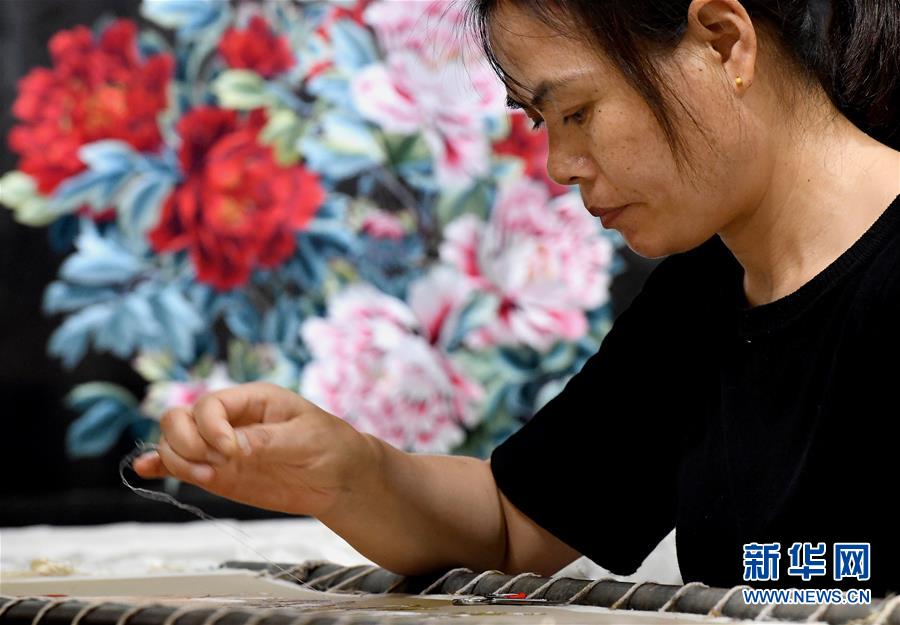 在開(kāi)封市素花宋繡工藝有限公司的展示館里,王素花的徒弟劉冬紅在刺繡(7月30日攝)。新華社記者李安攝