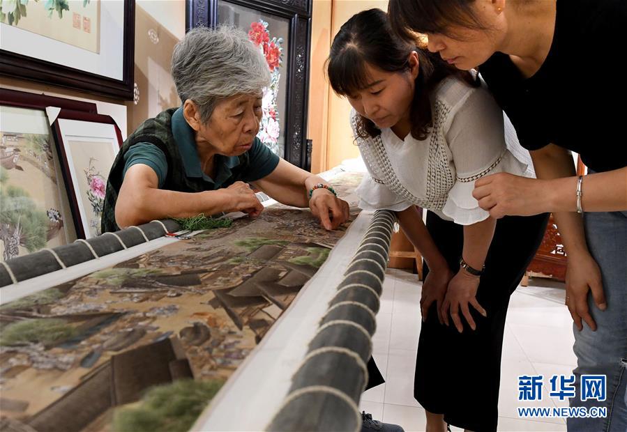 在開封市素花宋繡工藝有限公司的展示館里,王素花指出徒弟們繡品上需要修改的地方(7月30日攝)。新華社記者李安攝