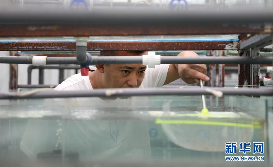 8月4日,張忠堡村村民趙世龍?jiān)谟^察育種筐里的觀賞魚(yú)排卵狀況。新華社記者姚劍鋒攝