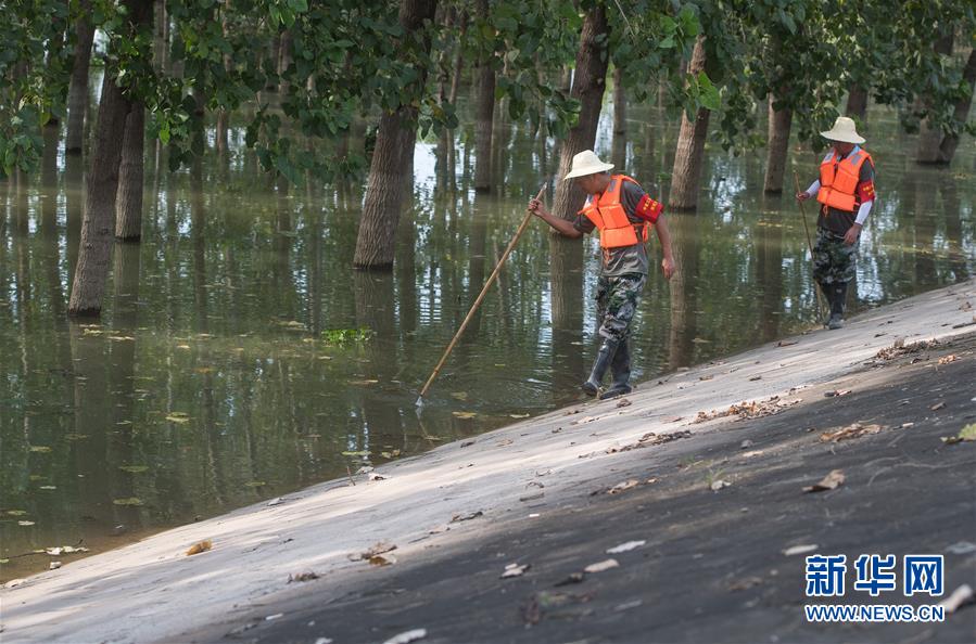 8月5日,夏德勤(左)與同事在長江武金堤迎水面巡查。新華社記者肖藝九攝