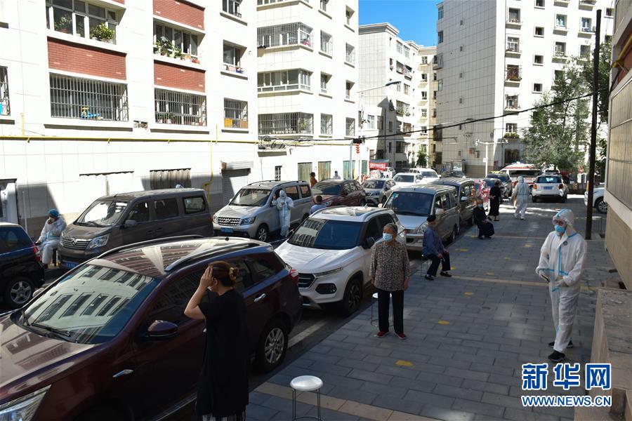 8月5日,居民在烏魯木齊市天山區(qū)山西巷社區(qū)排隊(duì)等待核酸檢測(cè)。新華社記者高晗攝