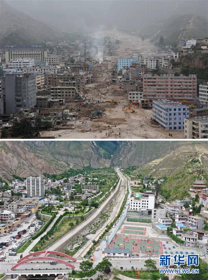 拼版照片:上圖為2010年8月13日拍攝的舟曲特大山洪泥石流災(zāi)害受災(zāi)核心區(qū)域(新華社記者王鵬攝);下圖為2020年7月15日用無(wú)人機(jī)拍攝的位于受災(zāi)核心區(qū)域的三眼峪山洪泥石流排導(dǎo)渠(新華社記者杜哲宇攝)。新華社發(fā)