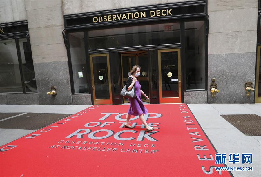 8月6日,在美國紐約,一名女子從洛克菲勒中心觀景臺的入口走過。當(dāng)日,3月份暫時關(guān)閉的洛克菲勒中心觀景臺恢復(fù)對公眾開放。每天13時至21時,人們可戴口罩前往參觀。新華社記者王迎攝