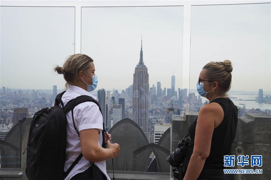 8月6日,在美國紐約,人們在洛克菲勒中心觀景臺上觀看城市景觀。當(dāng)日,3月份暫時關(guān)閉的洛克菲勒中心觀景臺恢復(fù)對公眾開放。每天13時至21時,人們可戴口罩前往參觀。新華社記者王迎攝