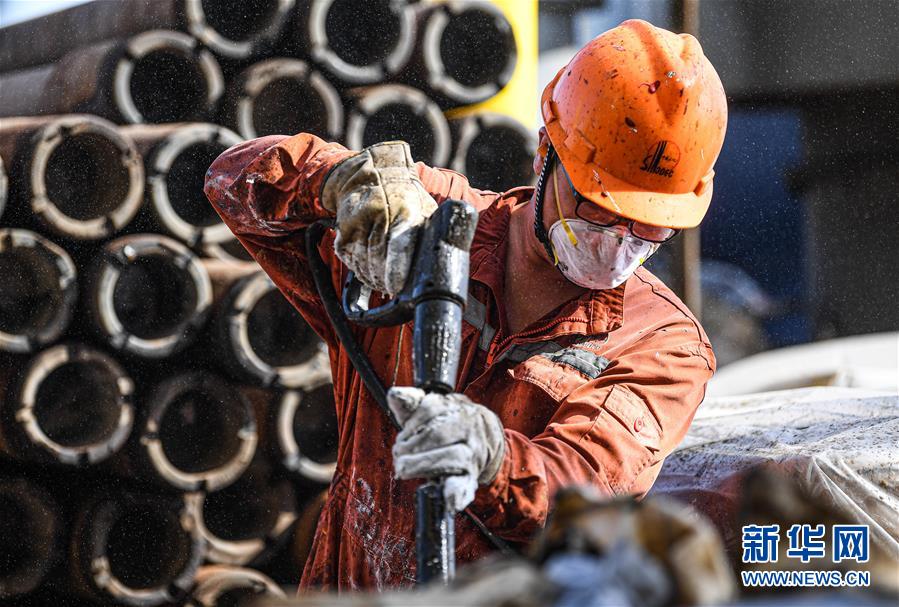 7月26日,在位于南海北部海域的勘探三號鉆井平臺上,鉆井工人在擺放鉆桿。新華社記者蒲曉旭攝