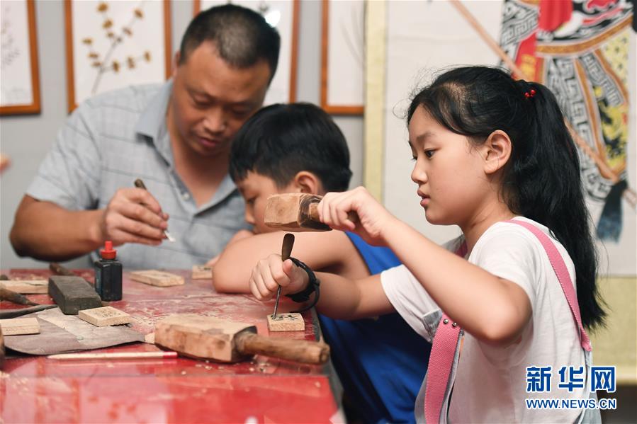 8月8日,小朋友在長沙市非物質(zhì)文化遺產(chǎn)展示館體驗望城新康木雕技藝。新華社記者 薛宇舸 攝