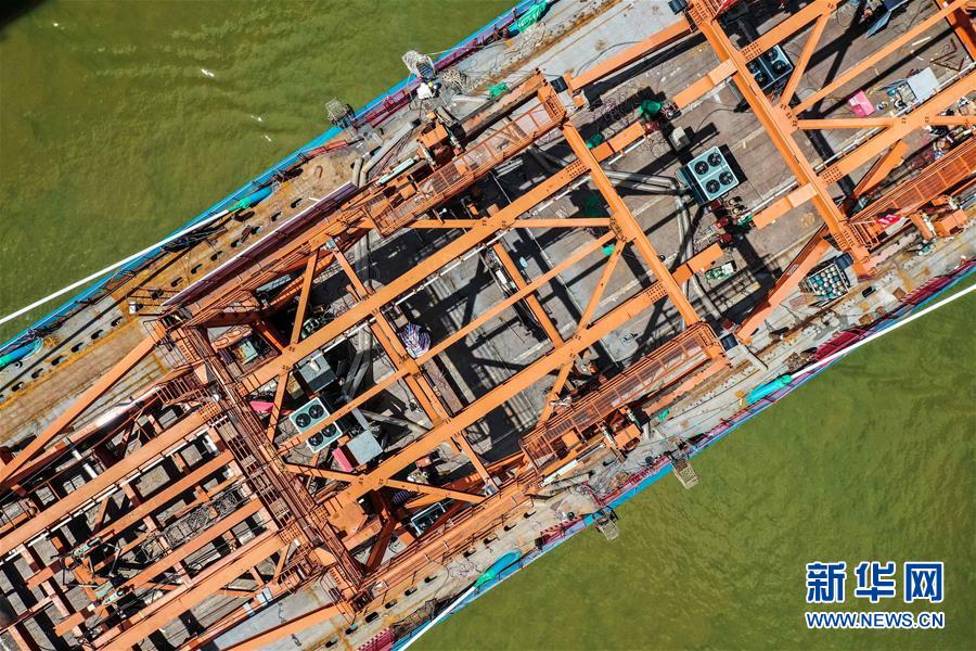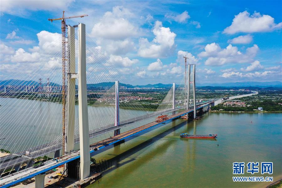 8月9日拍攝的廣州南沙港鐵路跨西江特大斜拉橋最后一塊鋼箱梁吊裝施工現(xiàn)場(無人機(jī)照片)。當(dāng)日,中鐵十一局承建的粵港澳大灣區(qū)基礎(chǔ)設(shè)施“硬聯(lián)通”重點(diǎn)工程——廣州南沙港鐵路跨西江特大斜拉橋完成最后一塊鋼箱梁吊裝作業(yè),大橋即將合龍。該橋位于廣東佛山市和江門市交界處,全長1117.5米。新華社記者劉大偉攝。