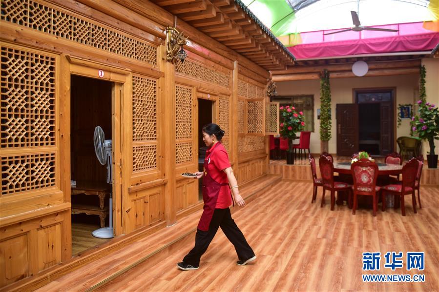 8月11日,尖扎縣昂拉鄉(xiāng)德吉村村民角巴措在自家民宿內為旅客送食品。新華社記者張龍攝