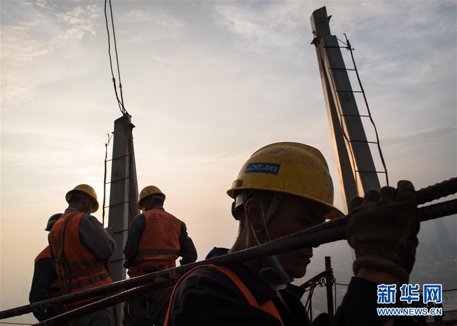 8月11日,工人在武漢綠地中心項目建設(shè)現(xiàn)場近500米的高空施工。新華社記者肖藝九攝