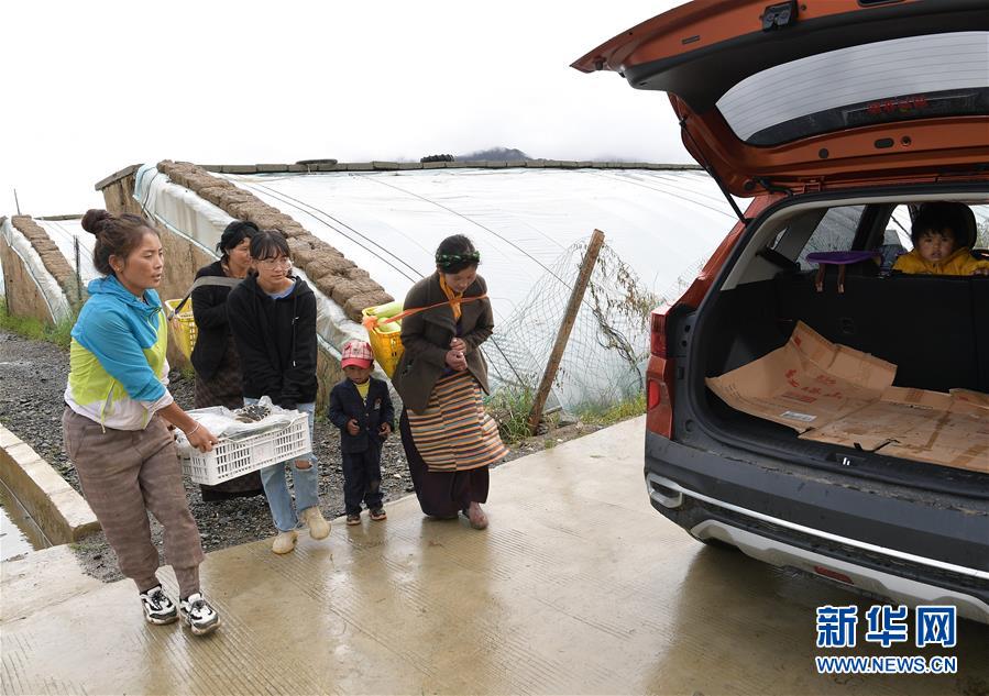 格桑旺姆(左三)和姐姐德吉卓瑪(左一)帶領(lǐng)工人將大棚出產(chǎn)的新鮮蔬菜抬上汽車,準(zhǔn)備運往店鋪銷售(8月3日攝)。新華社記者 李賀 攝