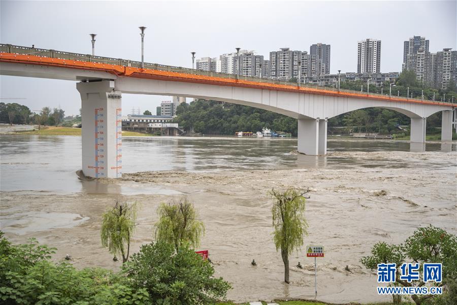 8月12日,洪水通過(guò)潼南城區(qū)。受強(qiáng)降雨影響,涪江潼南段迎來(lái)過(guò)境洪水。新華社記者 黃偉 攝