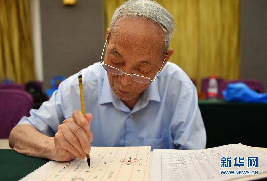 8月13日,陜西師范大學(xué)退休教師符有堂書(shū)寫錄取通知書(shū)。當(dāng)日,陜西師范大學(xué)2020年手寫錄取通知書(shū)正式開(kāi)筆。該校自2007年起采用毛筆書(shū)寫錄取通知書(shū)的方式,為新生傳遞佳音。今年,學(xué)校十余位退休教師、在職教師、校友代表等書(shū)法愛(ài)好者將為約4500名新錄取的本科生送上帶著墨香的大學(xué)錄取通知書(shū)。新華社記者張博文攝