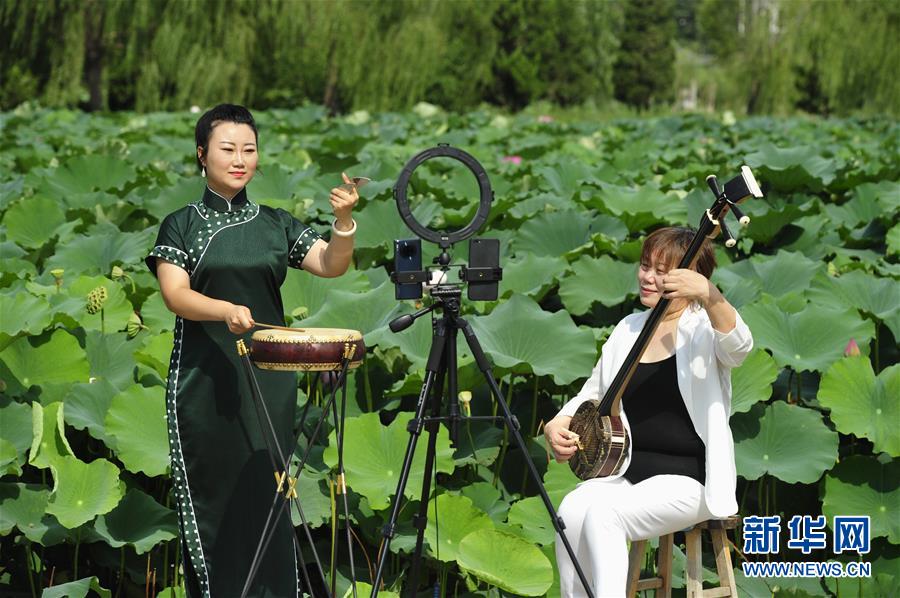 8月13日,河北省河間市西河大鼓非遺項(xiàng)目藝人李雪(左)、張領(lǐng)娣通過網(wǎng)絡(luò)直播表演西河大鼓。暑假期間,河北省河間市文化館推出非遺展演“云端”播系列活動,組織當(dāng)?shù)匚骱哟蠊姆沁z項(xiàng)目傳承人利用視頻直播的方式進(jìn)行線上展演,通過“云端”傳承非遺文化。新華社記者朱旭東攝